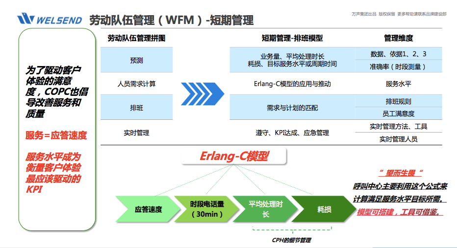 接着是人力需求计算。人力需求的计算是跟着长期预测和短期预测来进行的。能力规划模型对应的是长期预算,得到的人力是用来做招聘和培训的。排班模型对应的是短期预算,得到的人力是用于排班的。它们都类似于一套计算的方式或者计算的公式。需要提醒一点,因为招聘和培训都需要时间,所以能力规划模型要提前与招聘培训进行沟通的,了解招聘和培训的时间需要多长。针对排版模型,COPC推荐使用Erlang-C模型进行测量。