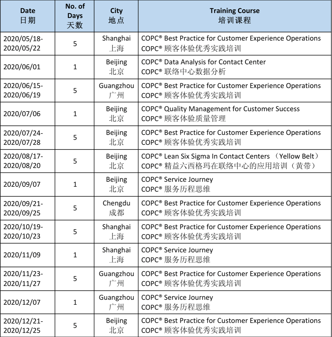 COPC Inc.为支持顾客体验的运营机构提供咨询、培训、认证和RevealCX™软件解决方案。COPC Inc.创建了COPC标准族,其中包含了适用于联络中心运营、顾客体验管理、外包商管理和采购管理的标准体系。COPC Inc.成立于1996年,并一直致力于帮助联络中心提升运营绩效。现在,COPC Inc.已成为全球范围内的创新领军者,助力企业优化运营,从而提供卓越的服务历程。COPC Inc.总部设立在美国佛罗里达州冬园市,并在欧洲、中东、非洲、亚太、拉美、印度和日本设有分部。了解更多,请浏览COPC Inc.官方网站:www.copc.net.cn(中文);www.copc.com(英文)。