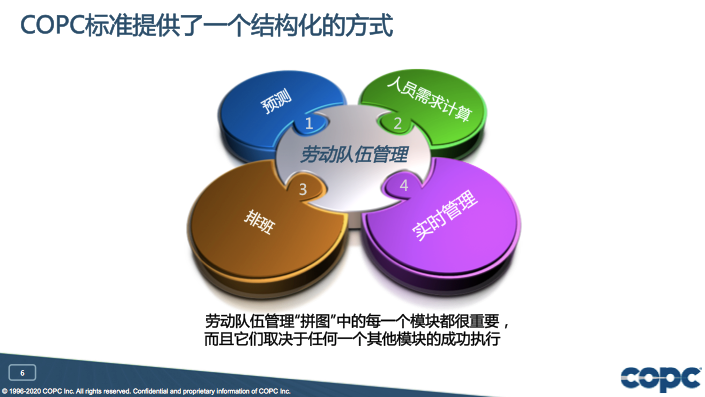 以上就是COPC标准中针对于劳动队伍管理模型的四个拼图,涵盖了COPC在预测、排班和实时管理中的全部要求。每一块拼图都非常重要了。希望大家能够在接接下来的工作当中,把每一块拼图都完成得非常好,在劳动队伍管理模型中达到目标的应答速度,也同时实现控制运营成本。