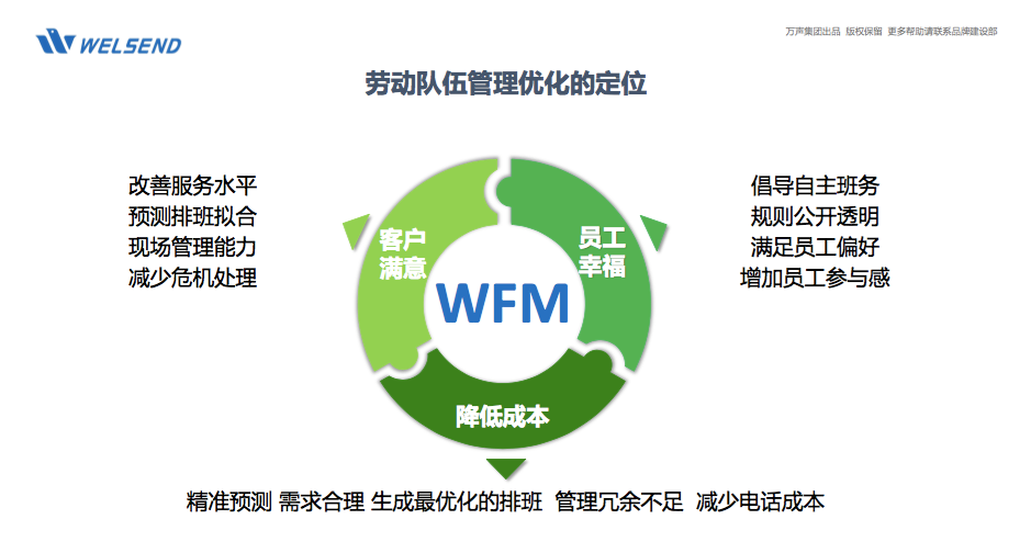 万声劳动队伍管理优化的定位是什么?万声是BPO的外包呼叫中心,面对的客户行业领域很多,业务类型很多,同时在全国有多个站点的运营。在保障客户满意和员工幸福的前提下,我们认为降低成本才是最优解。客户满意是指本着改善队列的服务水平,让预测和排班更加拟合,提升现场管理人员能力,减少危机处理的可能性。员工方面,万声把整体的排班规则公开透明化,员工可以自主班务以满足个性需求,增加了参与感。本着降低成本的最优解,万声一定要做到精准预测,需求合理、生成最优化的排班,同时管理冗余和不足,降低整体电话成本。