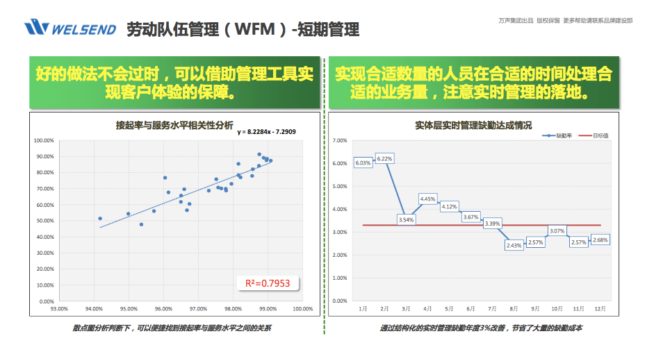 有了比较精准的人员需求计算,把合适的人数与合适的到达模式的业务量进行匹配后,一定要用实时管理的方式来验证。除了对遵时率的跟踪,我们还去跟踪计划外的一些数据,比如计划外缺勤。与COPC合作以来,万声年度缺勤实现了3%的改善,节省了大量的缺勤成本,证明了很可观的投资回报率。