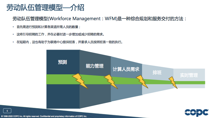 首先和大家分享一个关于在COPC经历的真实的小故事。每一次我们作为COPC的审核师进行认证,许多人都会和我们说同样的一句话,“我们的中心和别人的中心是不太一样的。”那我们COPC也有一个统一的回答,“商业模式或者业务类型可能确实不太一样,但COPC要求的结构化方式、框架以及体系几乎是一致的。”也就是说,COPC标准认为,在多变的商业环境下面,搭建一些结构化的方式、框架和体系是非常必要的。本次的分享主题集中在劳动队伍管理模型,也就是大家平时所说的预测、排班和实施管理 。