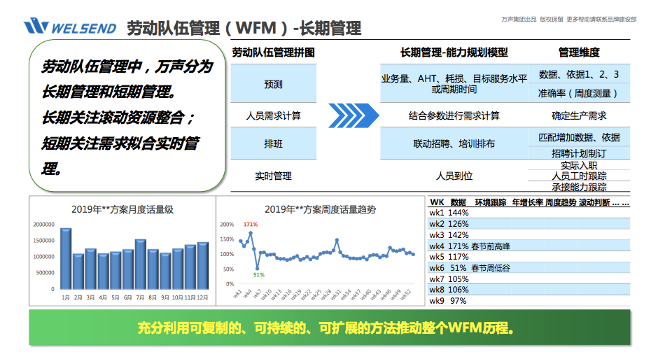 万声与COPC牵手的过程是痛并快乐的一个过程。在此之前,万声也有比较完整的自有管理体系,我们希望在原有的流程基础之上推陈出新,形成新的能力,故而引入了COPC标准的思维。COPC进入后的第一反应是“叫苦连天”的状态。相信每一个与COPC初次切磋的伙伴都会有一个很深刻的体会。虽然说痛苦着,但是也是很快乐的,快乐是因为真正的成功了。因为经过流程的标准化,解除了旧的思维模式,反复进行新鲜的实践,通过一轮、两轮、三轮乃至多轮的结构化支持会议,基线评估,以及万声内审的过程,很多方案得到了很好的运营实践。在这里我想和大家分享一下,我们一定要在原有流程的发展之下去考虑新的管理的探究。万声一直秉承着精细化管理的原则,和COPC融合之后,COPC成为了万声精细化管理中非常有效的抓手。我们从这个过程中提炼出了有效的工具,助力万声精细化的实现。最终,万声希望在整体的运作模式下,多个方案在全局方面上可复制,可推广,最终实现全局性的方式。我们不聚焦于只解决单一方案的问题,而是能够面对整体突发情况的应对,或者是说关键流程的落地。今天和大家分享的具体流程是万声在WFM体系落地过程中的一些改变和流程变化,以及一些比较好的方法。